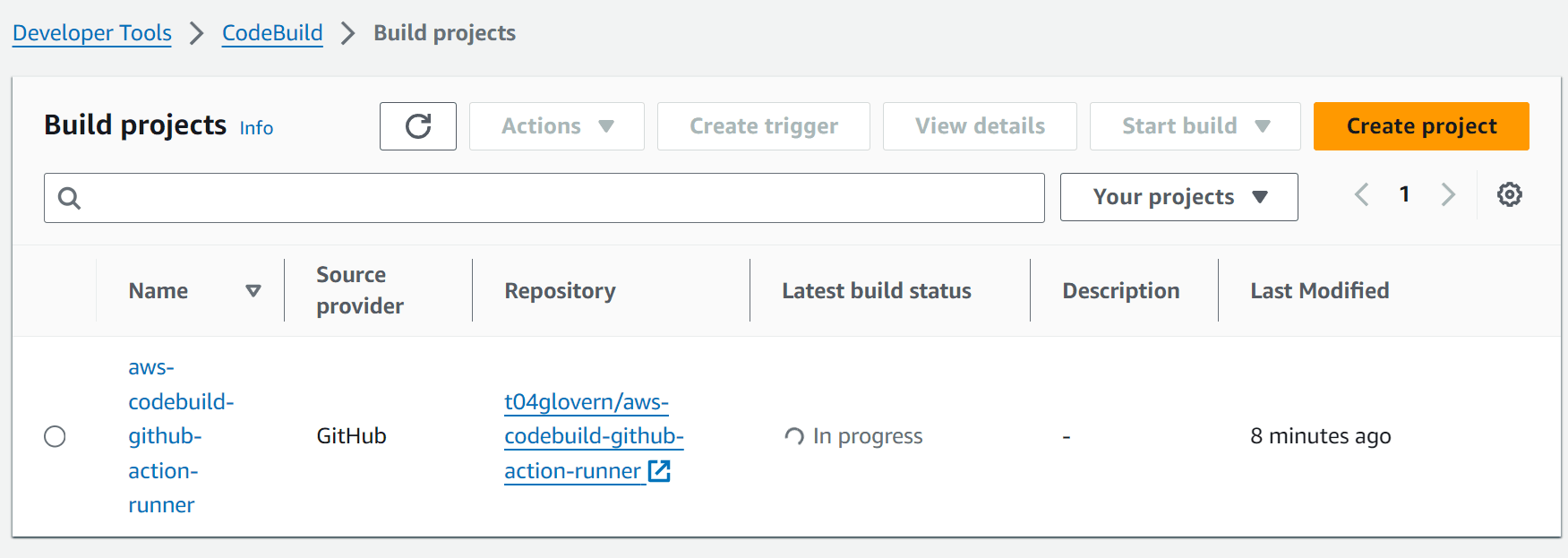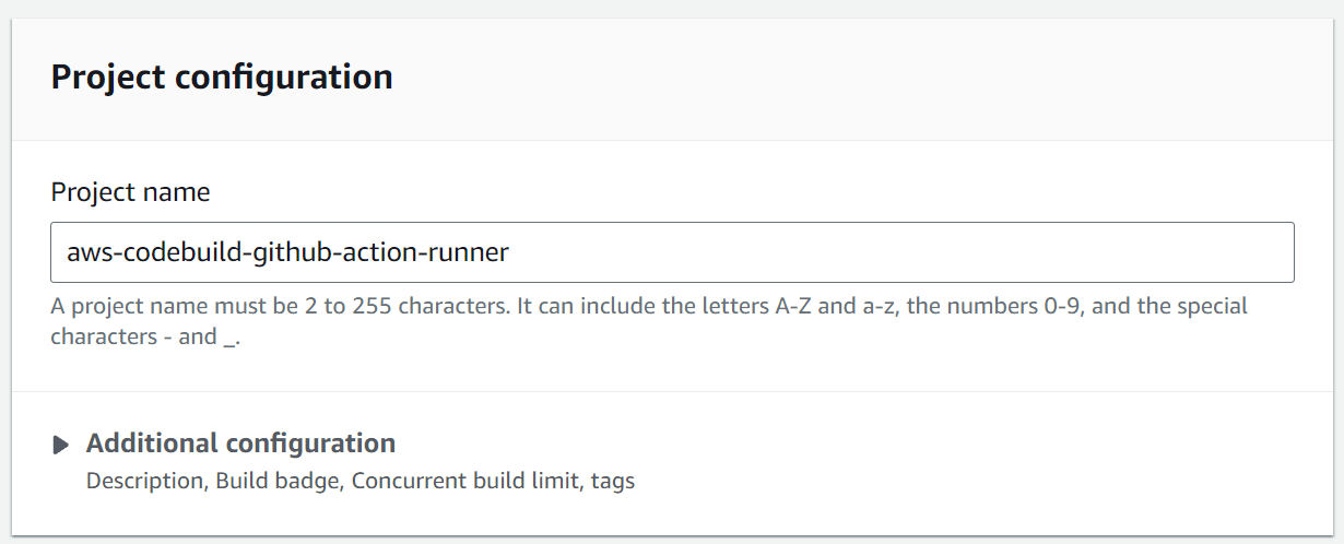 Navigate to the CodeBuild console and click Create build project. I am going to call the project the same name as the repository: aws-codebuild-github-action-runner.