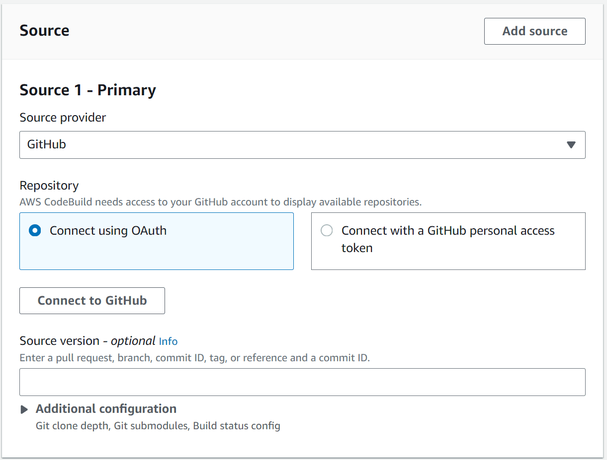 Select the source provider as GitHub and Connect using OAuth, then click Continue to GitHub.
