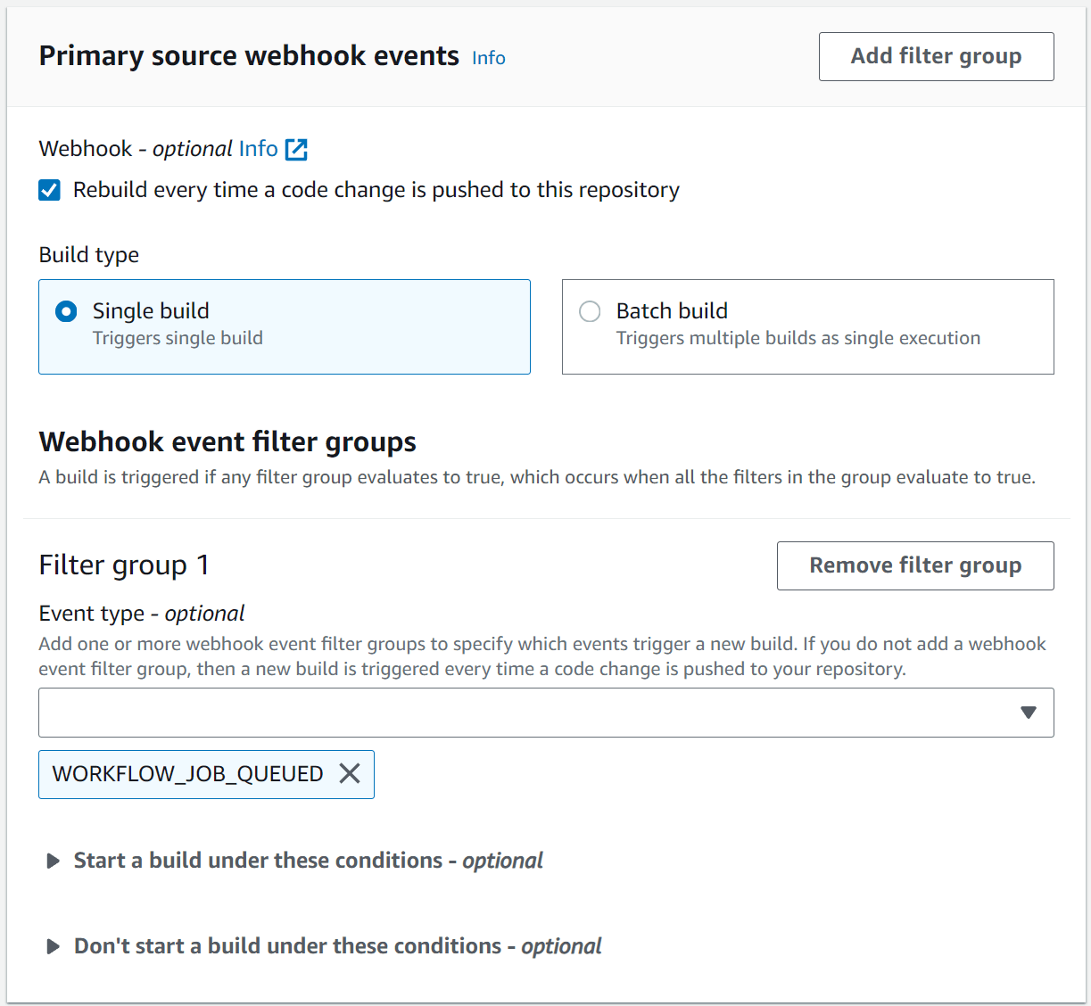 Note: CodeBuild will only process GitHub Actions workflow jobs events if a webhook has filter groups containing the
