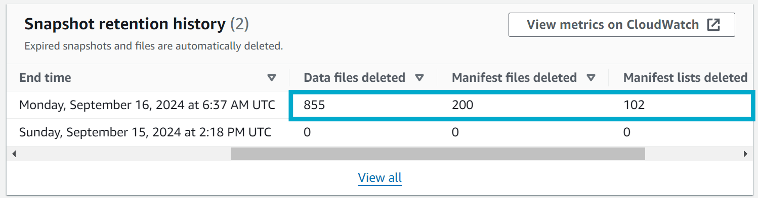 When the job runs, you should see the following in the Glue console under Snapshot retention history. There should be metrics indicating how many data and metadata files were deleted.